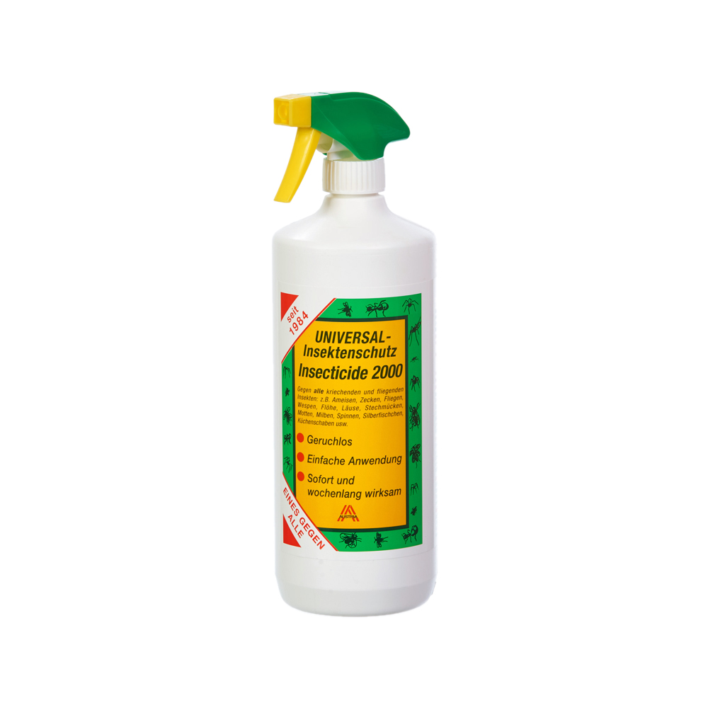 Insecticide 2000 ist ein InsektenSpray für die Behandlung von Problemen mit allen Insekten. Insecticide 2000 fällt in keine Giftklasse und kann im Haushalt, Garten und Gewerbe angewendet werden. Insecticide 2000 wirkt sowohl bei Aufnahme als auch bei Kontakt. Insecticide 2000 hat eine Langzeitwirkung von bis zu 4 Wochen, abhängig von der Oberfläche, auf die es aufgetragen wird. Im Freien, bei Sonnen- und Regeneinwirkung bzw. auf saugfähigen Flächen ist die Wirkung kürzer als bei optimalen Bedingungen. Insecticide 2000 ist einfach anzuwenden, geruchlos und verursacht keine Flecken.