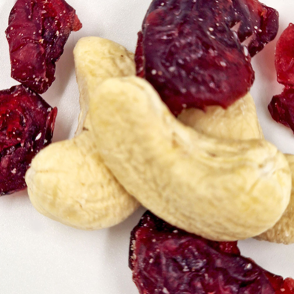 Inhaltsstoffe: Cranberries, Cashewkerne, Ananassaftkonzentrat, Ananassirup, Sonnenblumenkernöl