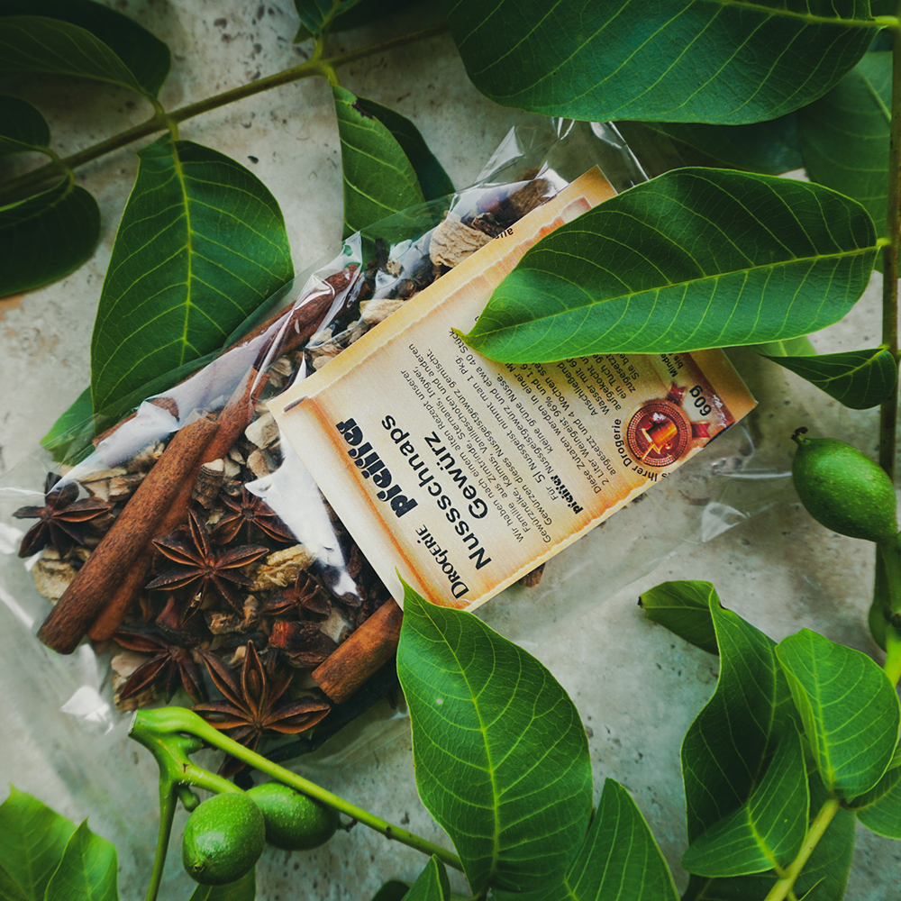 Zubereitung: 1 Packung Drogerie Pfeiffer Nussschnaps-Gewürz und etwa 40 Stück kleine grüne Nüsse werden in einer Mischung von 2 Liter Weingeist (96 Vol.%) und 1,6 Liter Wasser angesetzt und 4 Wochen stehen gelassen. Anschließend werden 1,4 Liter Wasser mit 60 dag Kandiszucker aufgekocht und dem vorher durch ein Tuch geseihten Nussschnaps zugesetzt.